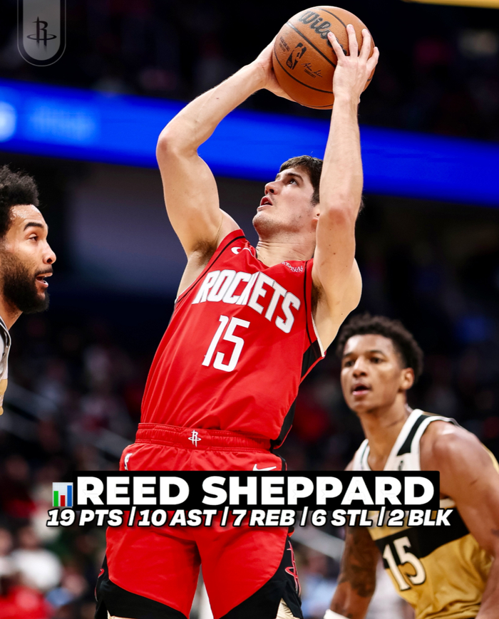 此役后谢泼德最近四场比赛,场均35.2分钟,拿到20.3分5.3助攻4.5篮板2.5抢断1.3盖帽,三分命中率44.4%,他本赛季先发的9场比赛火箭7胜2负。